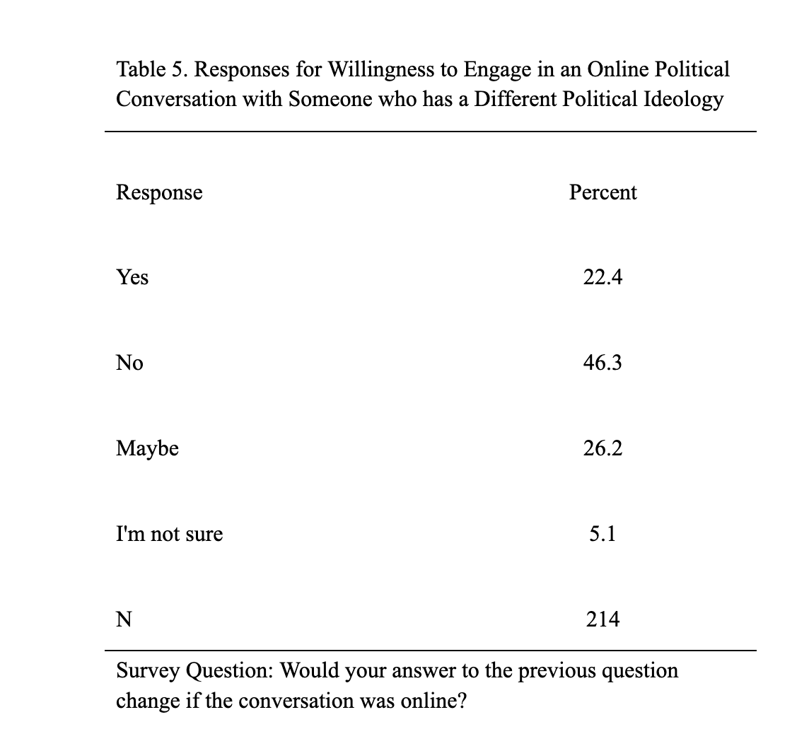 In Table 5, out of 214 respondents, 22.4% indicated that their willingness to engage in a political conversation with someone with a different political ideology would change if it were online. Moreover, 46.3% indicated that their answer would not change. In total, 31.3% of respondents did not give a definitive answer to the question, as 26.2% answered “maybe” and 5.1% answered “I’m not sure.”