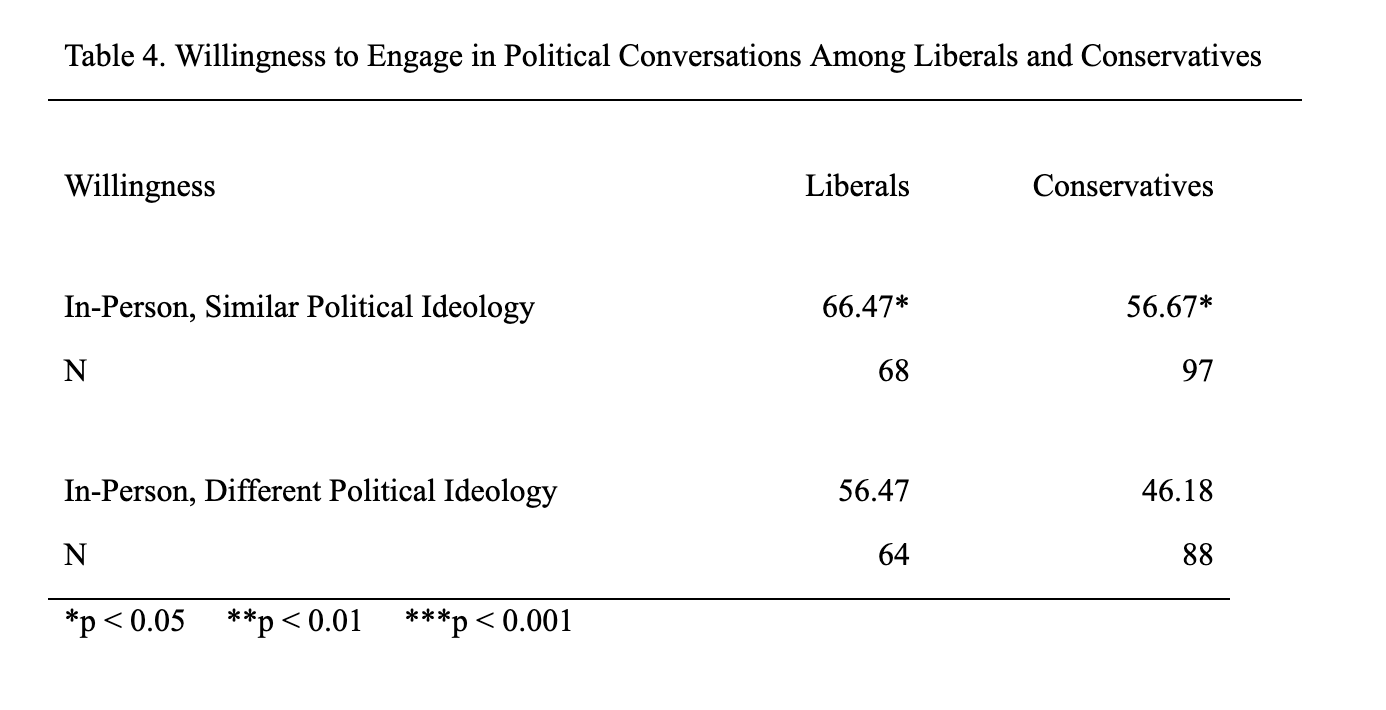 Like Table 3, Table 4 is a comparison of means between liberals’ and conservatives’ willingness to engage in in-person political conversations with someone who has a similar and different political ideology, respectively. Both means for in-person engagement with someone with a similar ideology are statistically significant (p < 0.05) among liberals and conservatives. However, this is not the case when it comes to having an in-person conversation with a different political ideology.