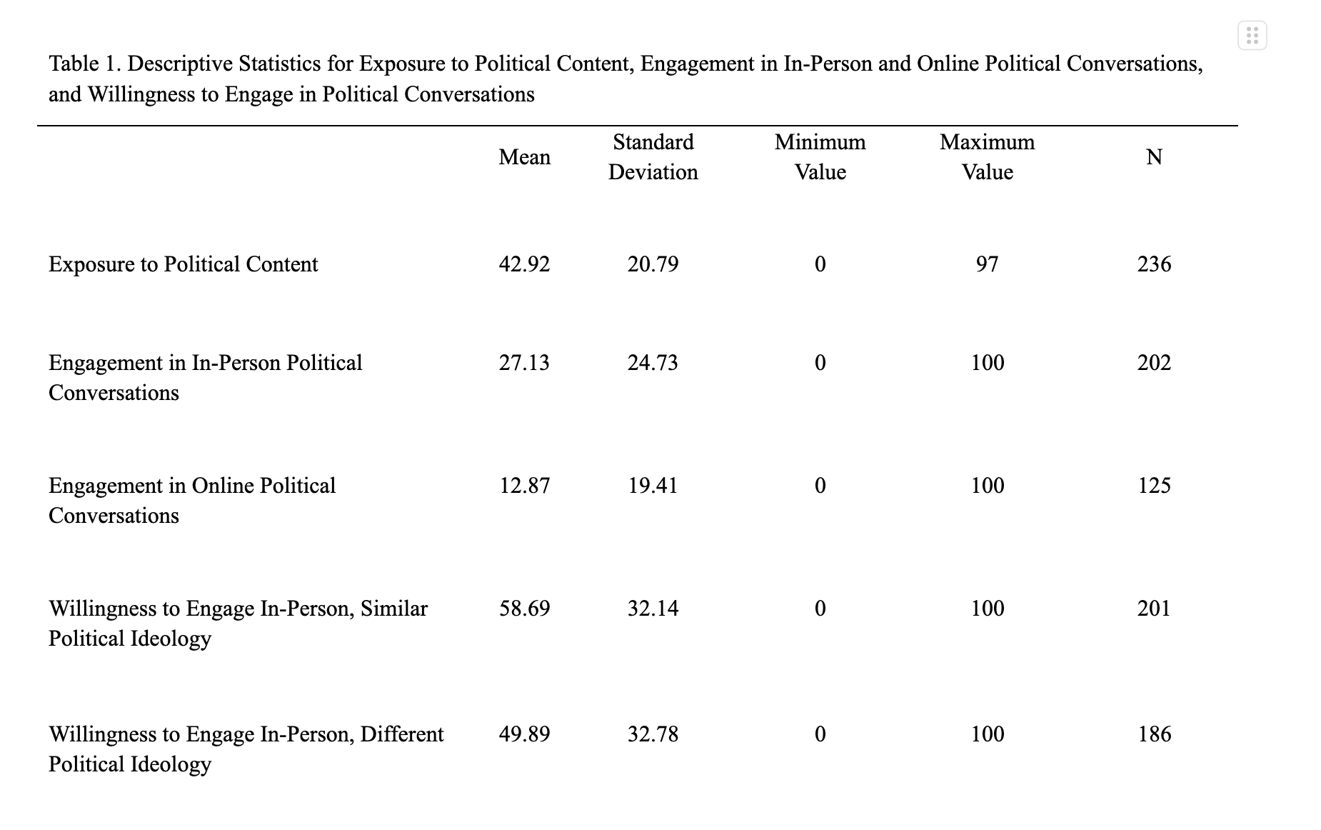 Table 1 shows descriptive statistics for independent and control variables. Respondents reported on average that less than half of content on their social media feed is made up of political content. This provides a baseline understanding of how much political content a given user sees during their time spend on social media.