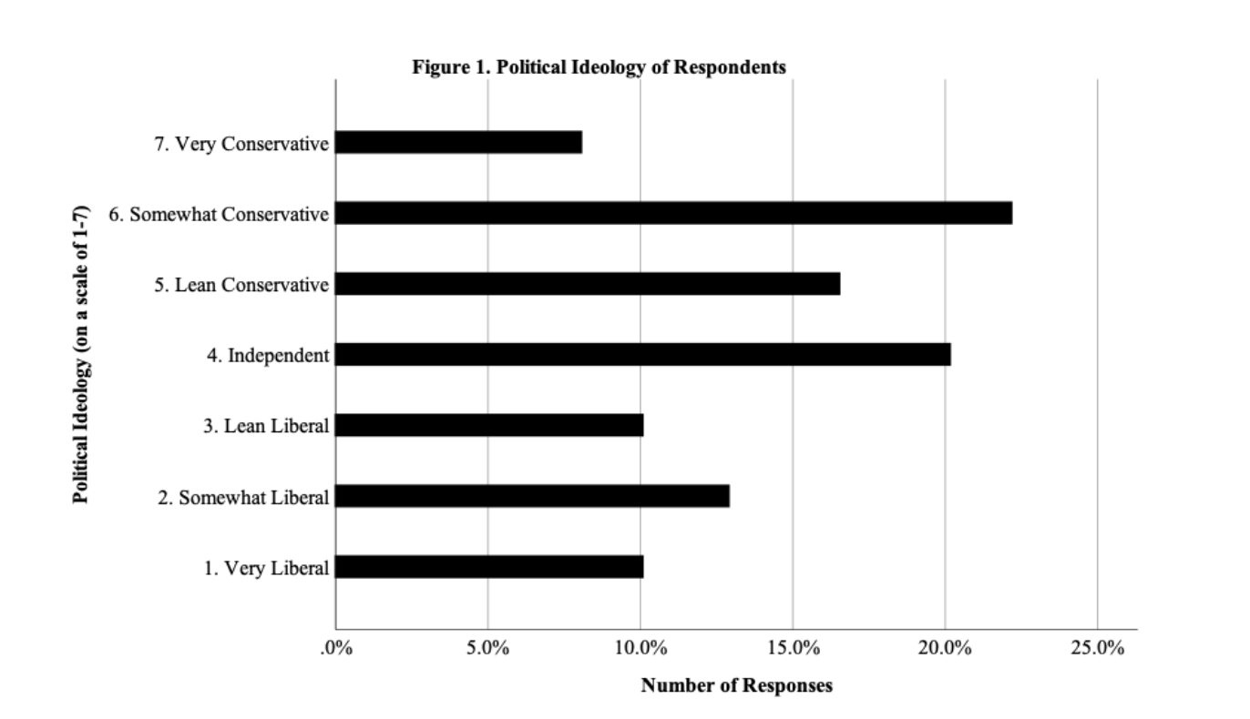 Figure 1 is a graph that shows out of 248 respondents, about 33.1% indicated that they are liberal in some way (10.1% very liberal, 12.9% somewhat liberal, 10.1% lean liberal). Moreover, 46.8% of respondents identify as a conservative in some way (8.1% very conservative, 22.2% somewhat conservative, 16.5% lean conservative). More than 20% of respondents indicated that their political ideology is independent. Overall, the median value is 4, which is “independent.”