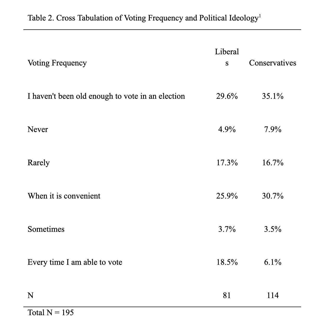 Table 2 is a cross tabulation of voting frequency among liberals and conservatives. I chose these two ideologies given that they made up most respondents. Many liberals (29.6%) and conservatives (35.1%) indicated they have not yet been old enough to vote in an election. Almost 5% of liberals say they never vote, but there is about a 13% increase in the number of these respondents who rarely vote (17.3%). Similarly, 7.9% of conservatives say they never vote, and about 16.7% of them rarely vote. Just over 48% of liberals and 40.3% of conservatives are politically engaged (they vote when it is convenient, sometimes, or every time they are able to do so). Overall, liberal respondents vote most frequently, and thus, are most politically engaged.
