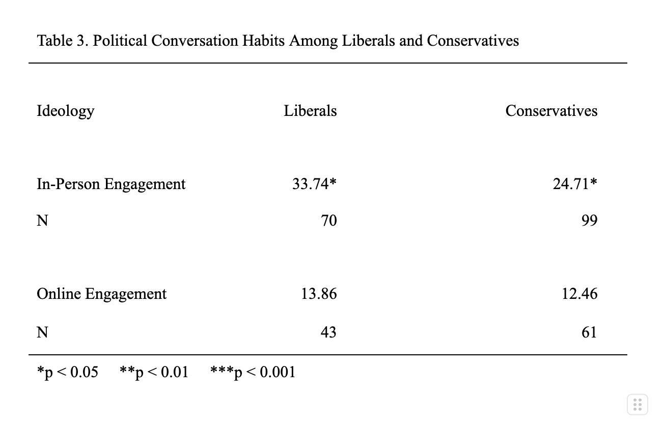Table 3 evaluates the mean political conversation habits among liberals and conservatives. On average, liberals indicated their engagement in an in-person political conversation with another Saint Anselm student is 33.74 on a scale of 0-100, whereas conservatives engage in these political conversations less often (24.71). On one hand, liberals’ engagement in an online political conversation with another Saint Anselm student is about 13.86 on a scale of 0-100. Conservatives, on the other hand, have engaged in these conversations less often (12.46). Both means are statistically significant (p < 0.05) when it comes to in-person engagement, but not online engagement. Therefore, on average, liberal respondents are more likely than conservative respondents to have engaged in an in-person political conversation.