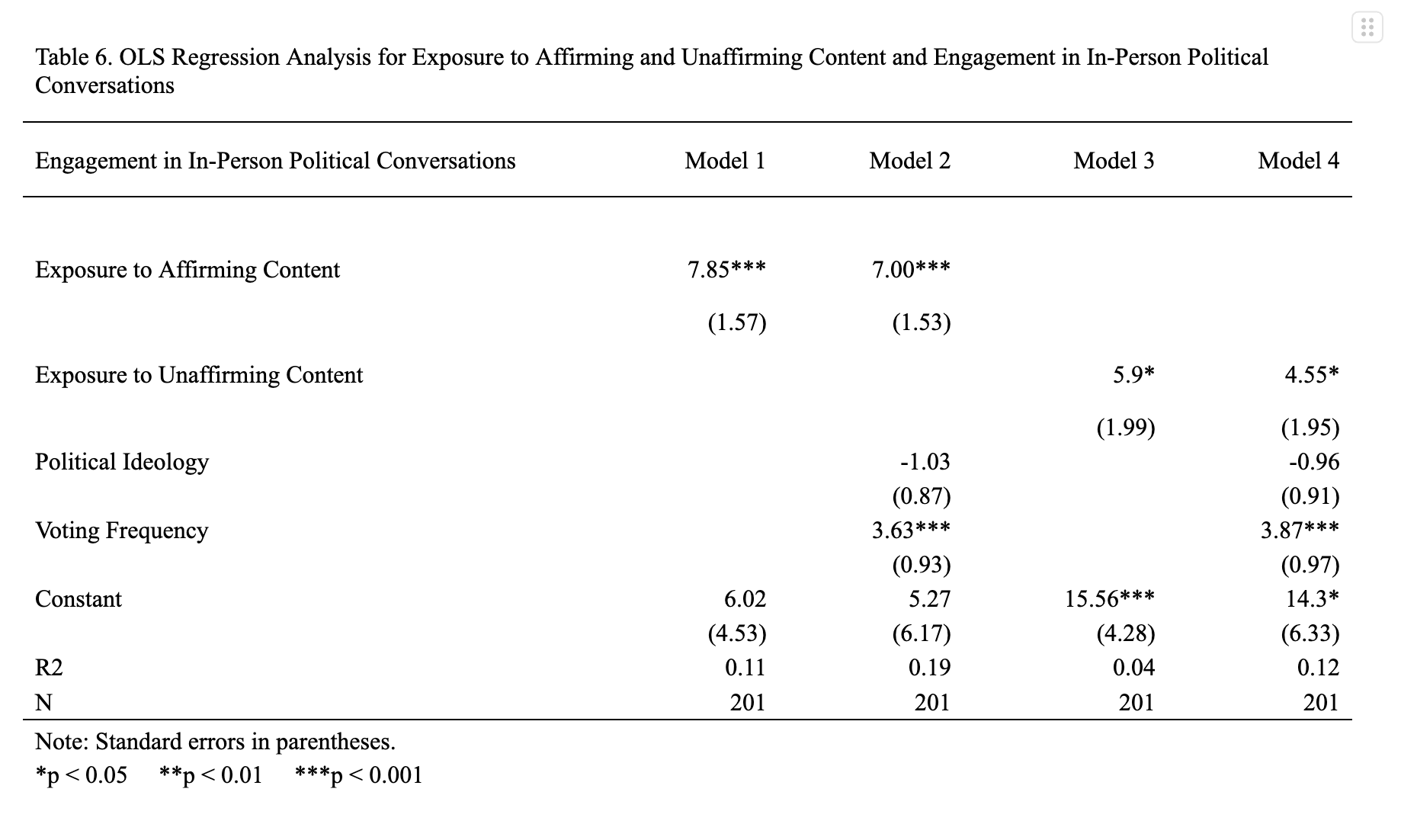 To test H1, I ran a bivariate regression, with exposure to affirming content as the independent variable and engagement in in-person political conversations as the dependent variable (Table 6, Model 1). The coefficient of exposure to affirming content is positive and statistically significant (p < 0.001). Therefore, for every 1-point increase on the 0-5 scale that measured exposure to affirming political content, engagement in an in-person political conversation increases by 7.85 points on the 0-100 scale measuring the dependent variable. This relationship does not affirm H1’s claim that the more affirming content a user sees, the less likely they are to have engaged in in-person political conversations. The R2 value explains that 11% of the variance in engagement in in-person political conversations is explained by exposure to affirming content.
