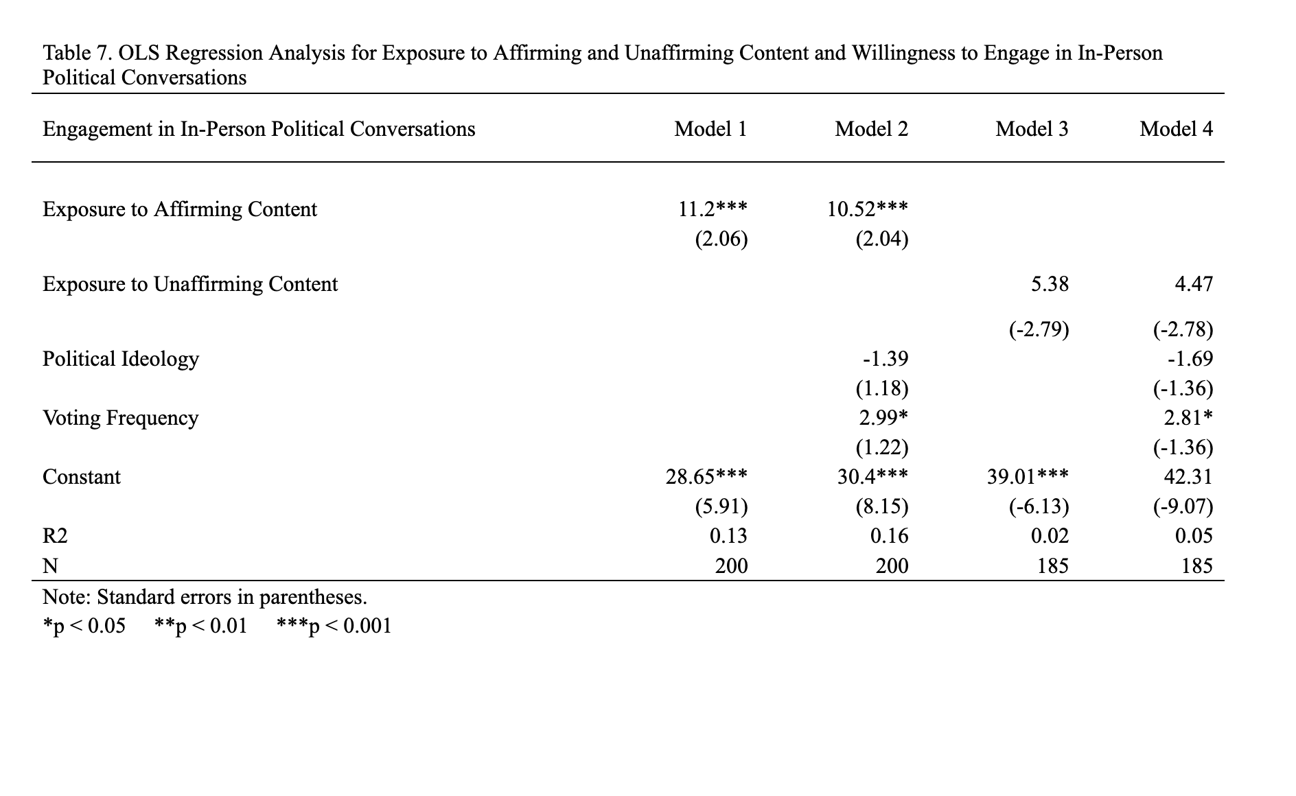 Finally, Table 7 also shows data from a bivariate regression (Model 3) and a multivariate regression (Model 4) used to evaluate H4. In Model 3, exposure to unaffirming content is the independent variable and willingness to engage in an in-person political conversation with someone who has a different political ideology is the dependent variable. The coefficient of exposure to unaffirming content is positive and statistically insignificant. The R2 value shows that 2% of the variance in the dependent variable can be explained by the independent variable.